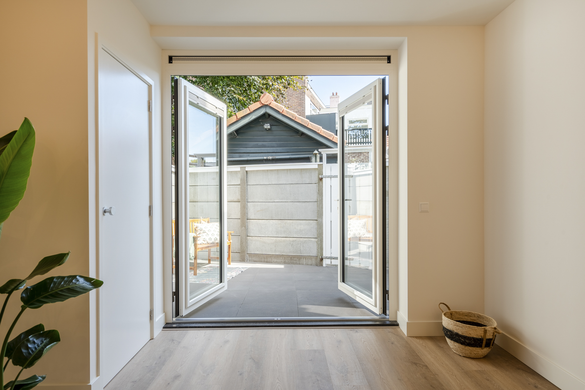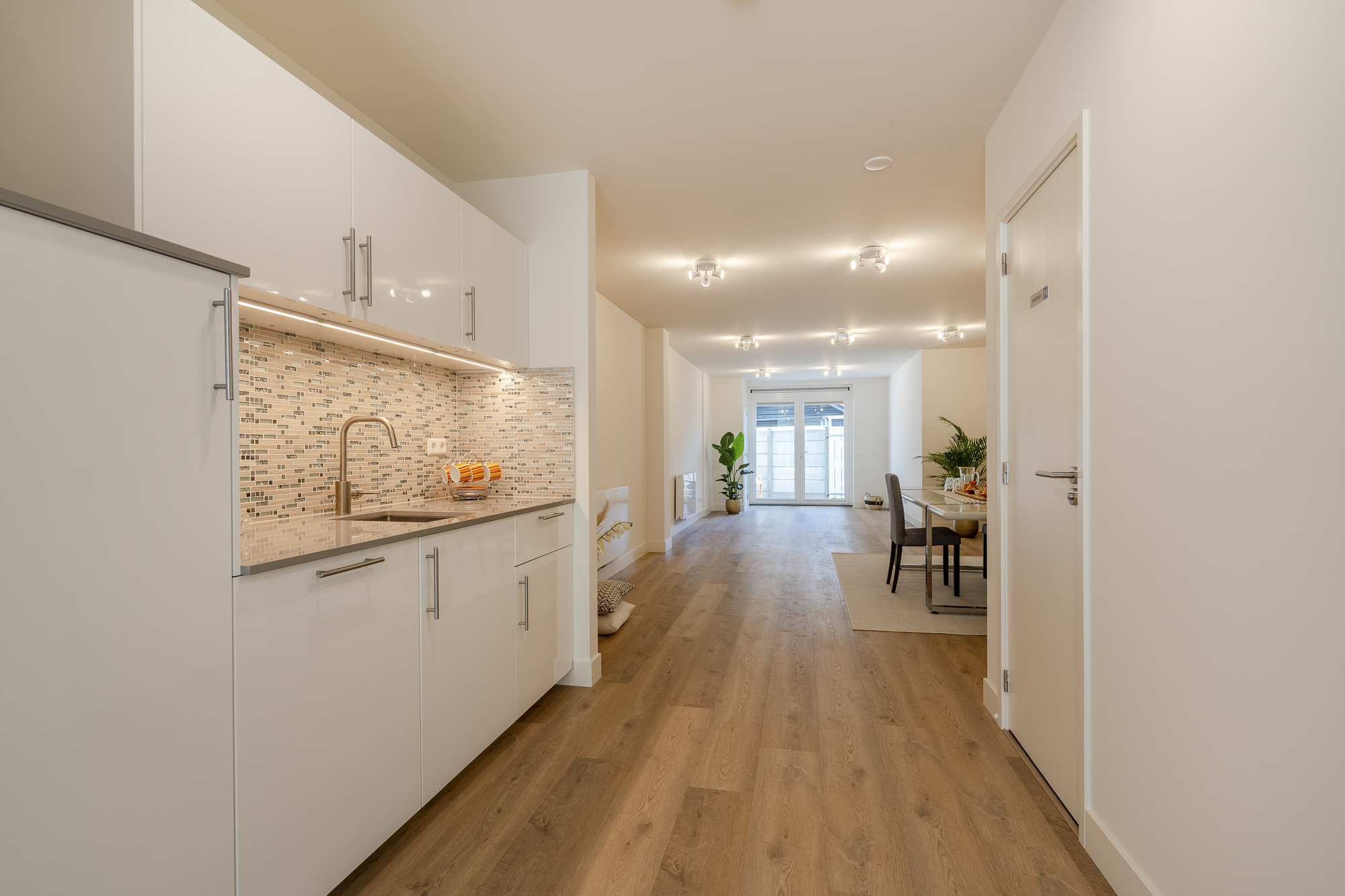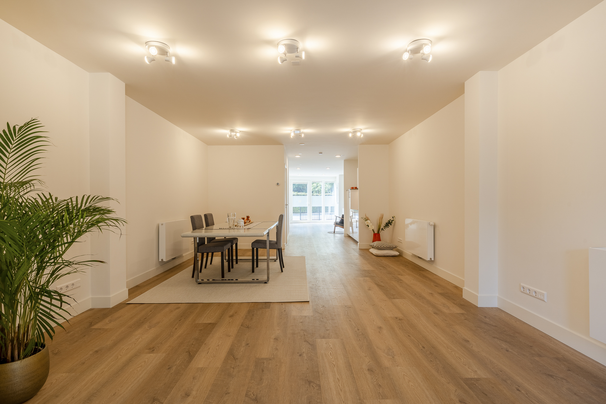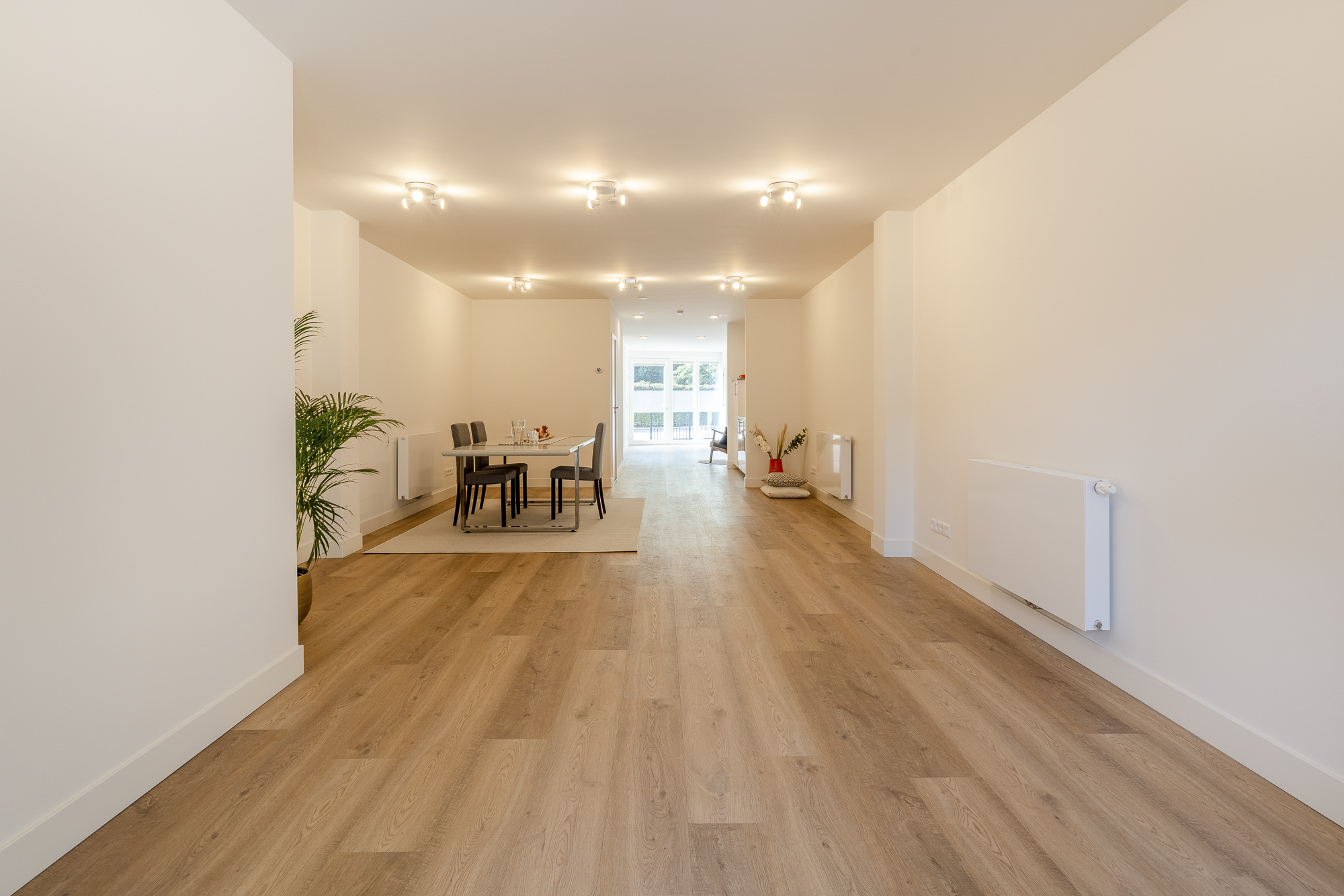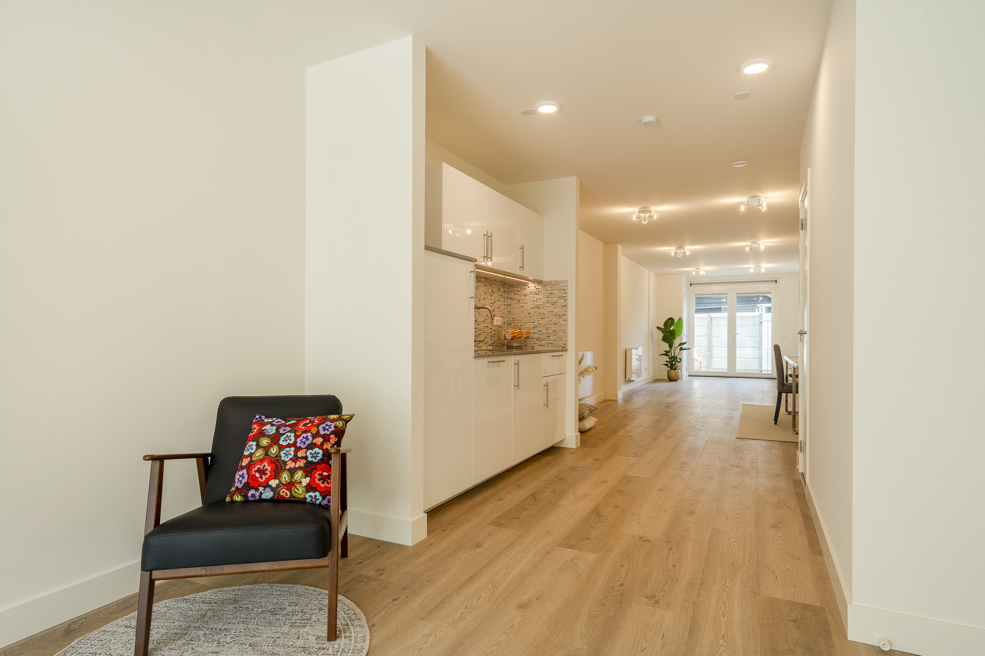 Via de gezamenlijke voortuin bereikt u de entree die een volledige glazen pui heeft welke is voorzien van een loopdeur. Bij binnenkomst valt direct de smaakvolle en kwalitatief hoogwaardige afwerking op en het open karakter van de ruimtes, welke zijn voorzien van functionele en sfeervolle verlichting.