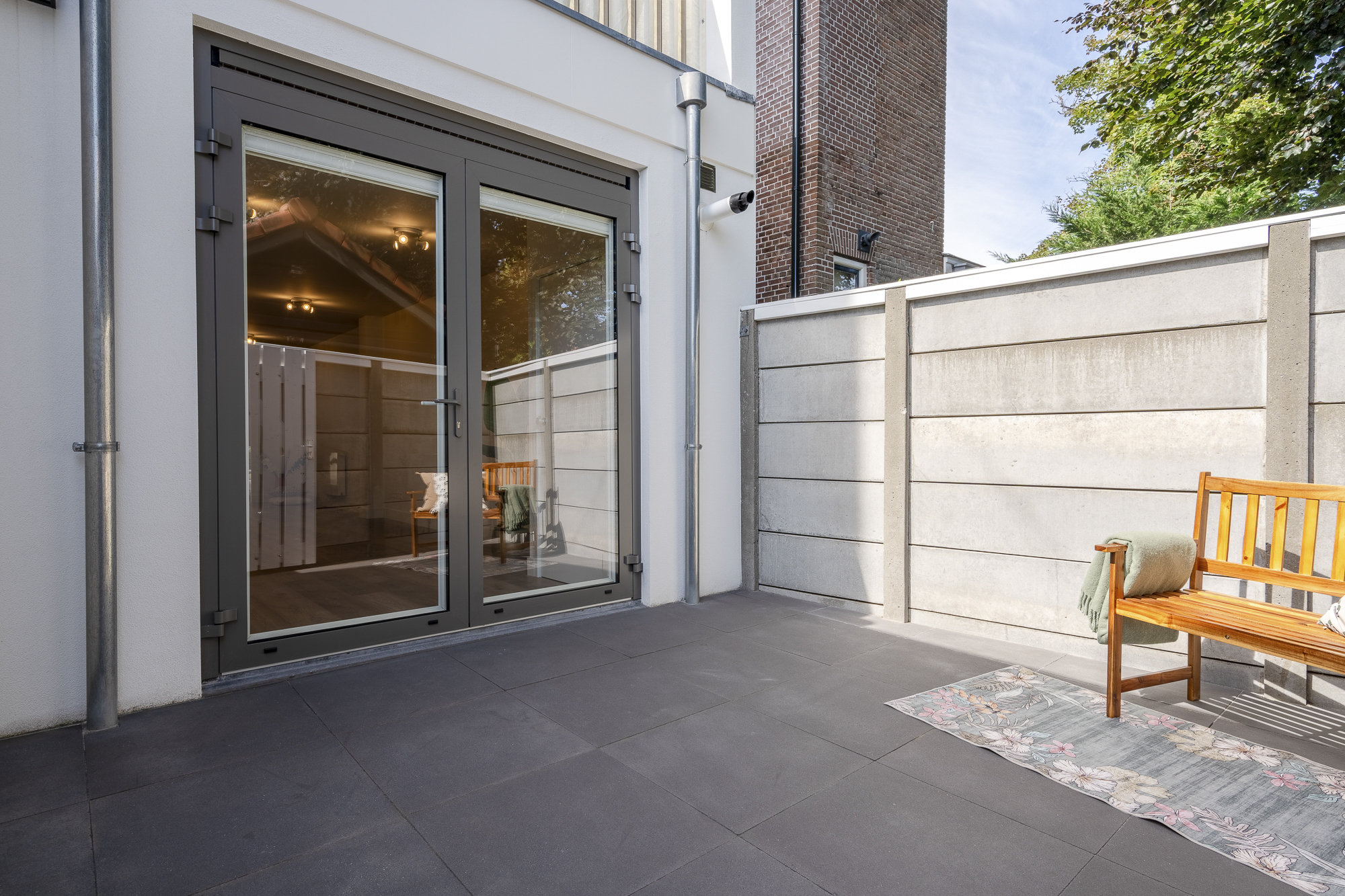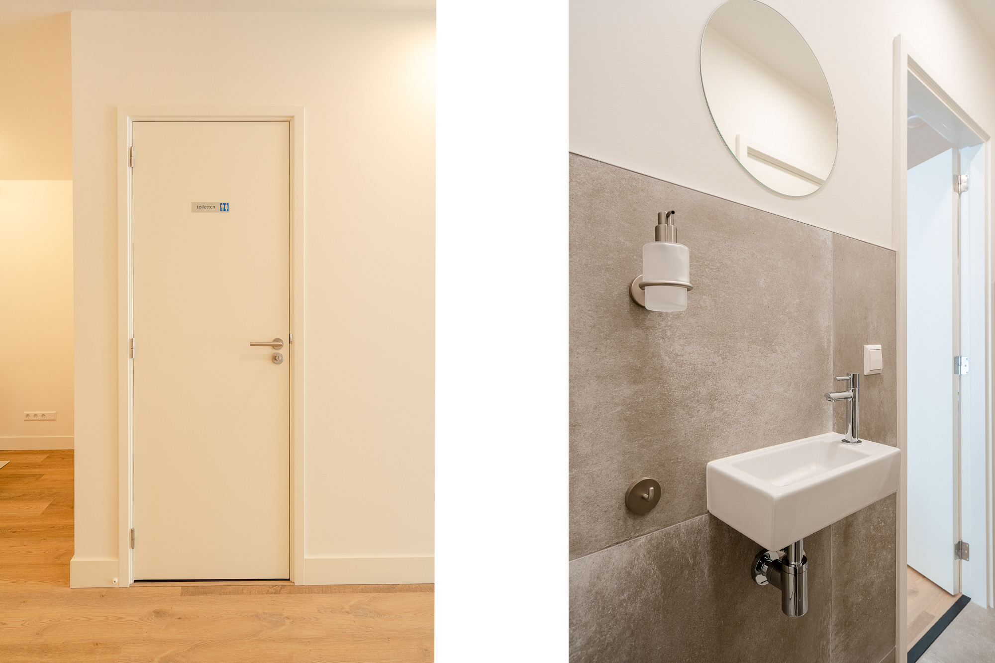 Through the shared front garden, you reach the entrance, which features a full glass façade with a pedestrian door. Upon entering, you'll immediately notice the tasteful and high-quality finishes and the open character of the spaces, which are equipped with functional and atmospheric lighting. The first open space, bathed in natural light, could be used as a reception or waiting area, for example. In the center is the luxurious kitchenette, equipped with a large refrigerator, dishwasher, sink, and ample cupboard space. Opposite the kitchen, you'll find the bathroom with two separate toilets, each luxuriously finished. At the rear is another very large room that can easily be divided into several practical office or practice units, according to your own preferences. The back garden is accessible through French doors, where you can enjoy the sunshine during lunch. You can also park your bicycle in the back garden, which is accessible via the locked gate from Kempenaerstraat. A stable and fast internet connection is provided by the availability of sufficient wall sockets, including fixed UTP connections, and a fiber optic connection.