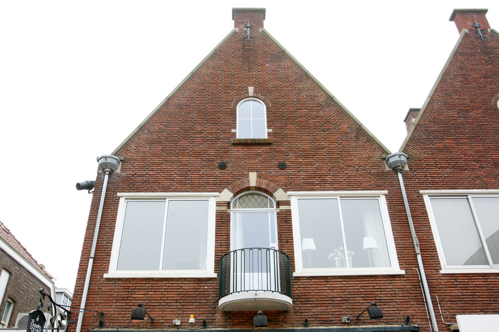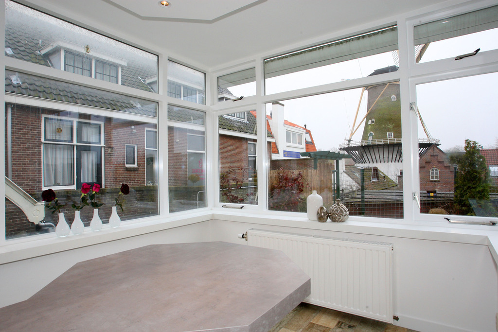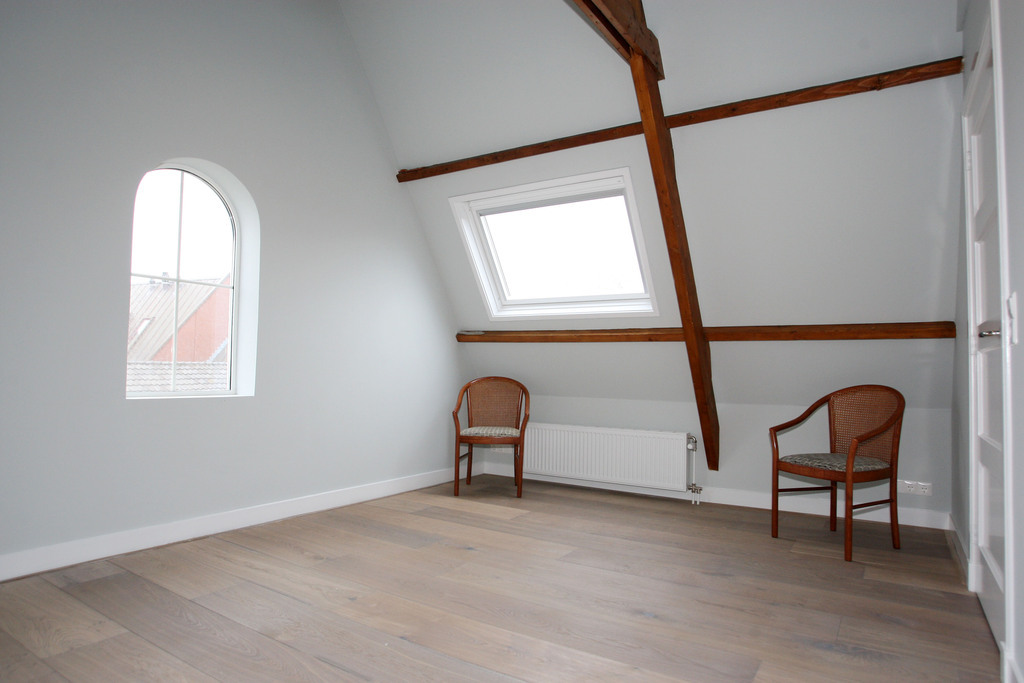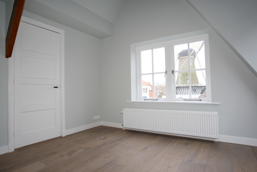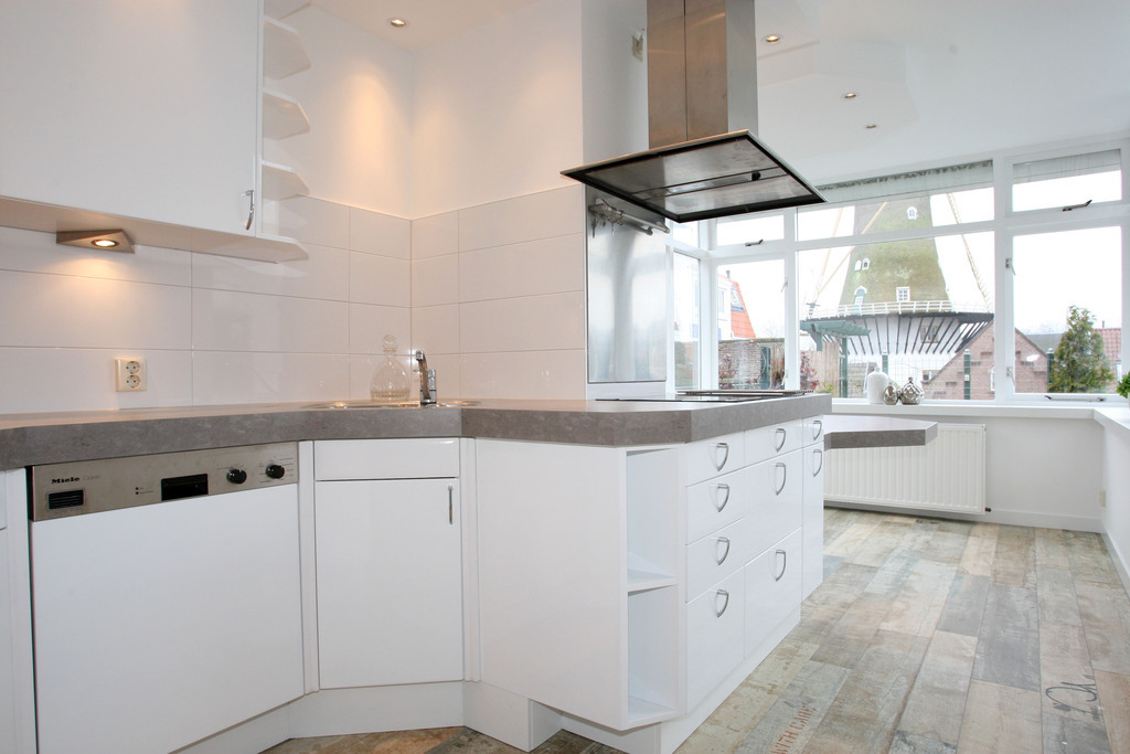 Hallway, toilet, living room with a fireplace and a small balcony at the front. At the rear of the living room, French doors lead to the spacious roof terrace with a view of the windmill. The roof terrace offers plenty of privacy and is equipped with sunshades (facing southwest). The kitchen/diner is fully equipped and has a dining table attached to the kitchen.